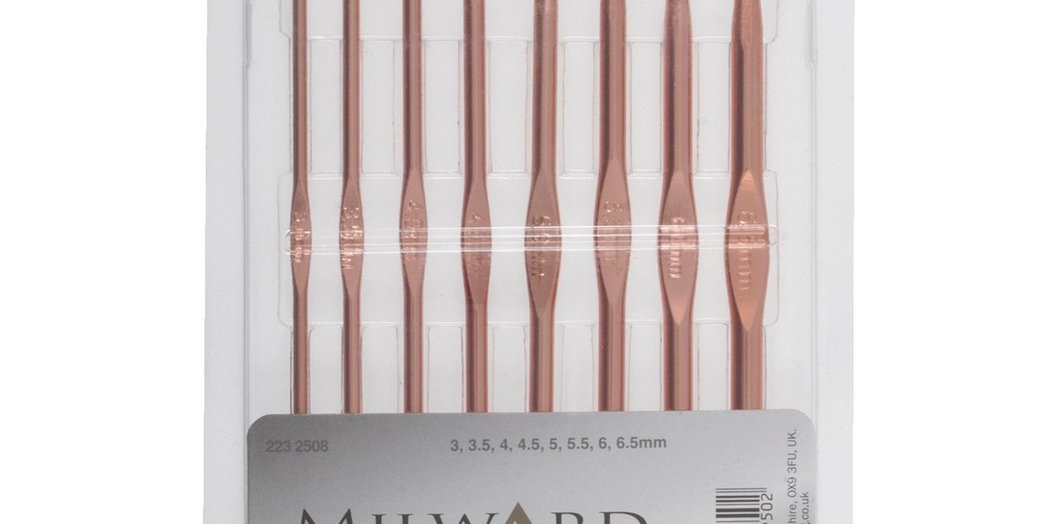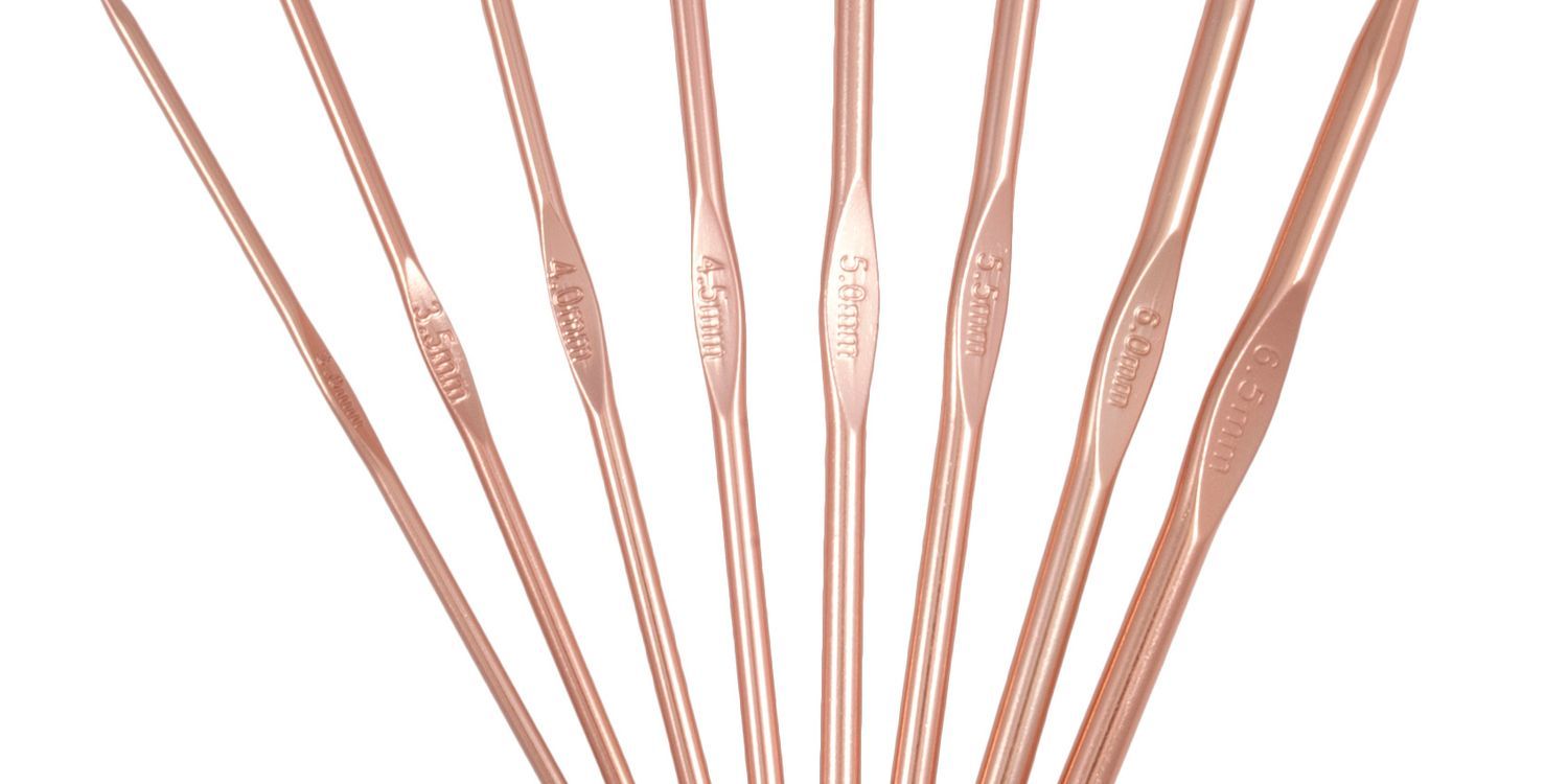 Set of 8 rose gold aluminium crochet hooks. Sizes: 3.00mm, 3.50mm, 4.00mm, 4.50mm 5.00mm, 5.50mm, 6.00mm and 6.50mm. Length: 15cm