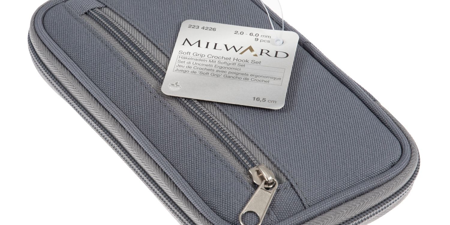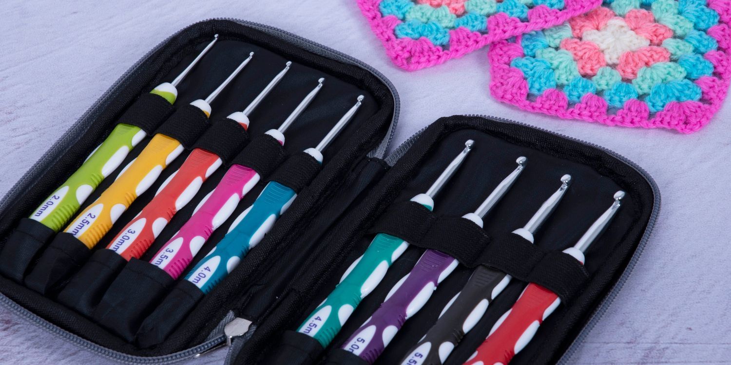 Zip case set of aluminium crochet hooks with colourful, ergonomic s oft-grip handles. Length: 16.5 cm