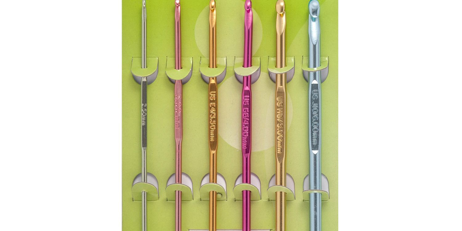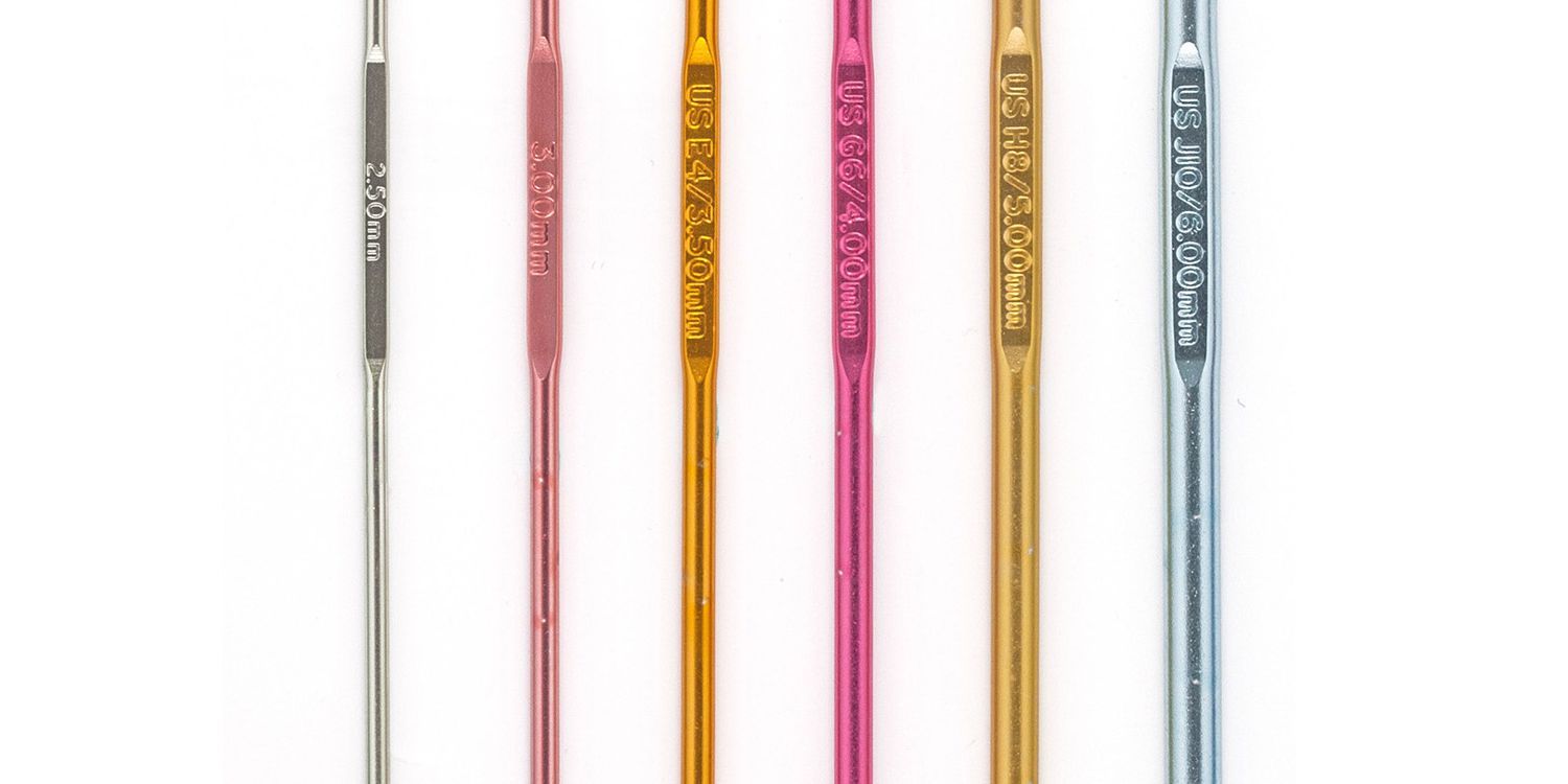 Made of highly polished, anodized aluminium which is very comfortable to handle and allows the wool to move smoothly across the hook. Colour coded sizing. 15cm long; 2.50 - 6.00mm.
