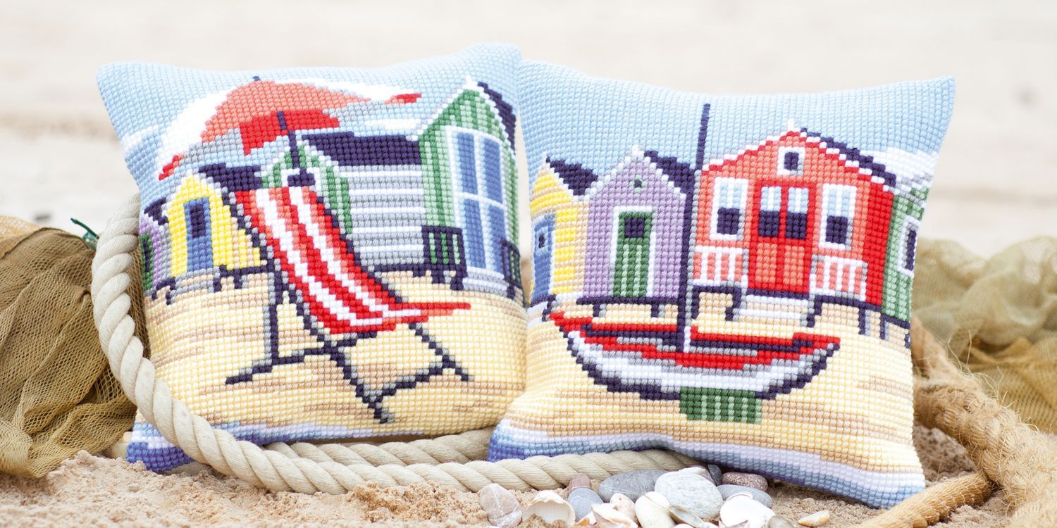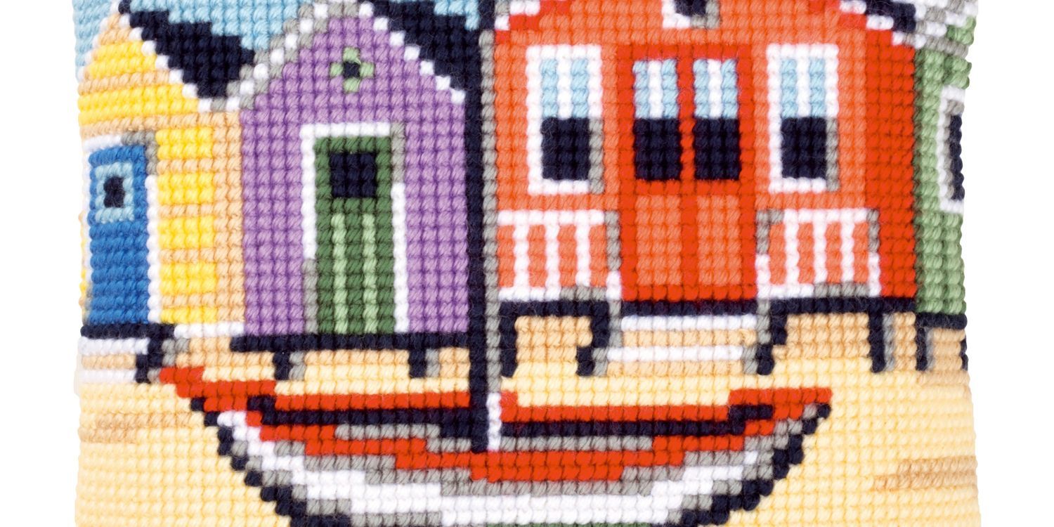 Cushion with cross stitch design. Kit includes: hand-painted, cotton, large hole canvas fabric (18 holes/10cm, 4.5 stitches/inch); thick acrylic yarn; needle, frontsheet picture; instructions in 8 languages (EN, NL, FR, GER, IT, SP, RU, SW). Approximate finished size: (w/h) 40 x 40cm or 16 x 16in. Age category: from 6 years. Stitches used: cross stitch. Difficulty level: very easy.