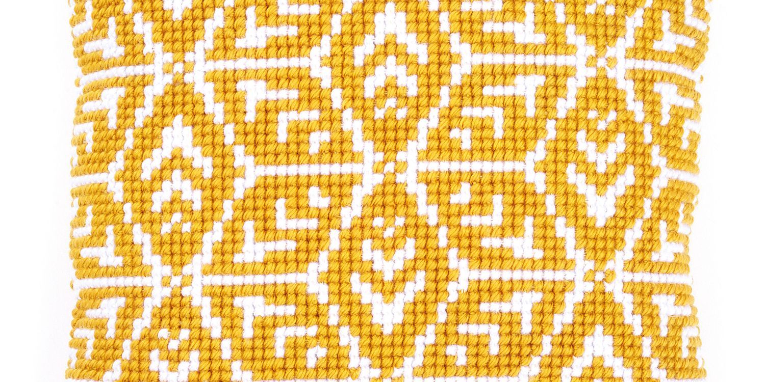 Cushion with cross stitch design. Kit includes: hand-painted, cotton, large hole canvas fabric (18 holes/10cm, 4.5 stitches/inch); thick acrylic yarn; needle, frontsheet picture; instructions in 8 languages (EN, NL, FR, GER, IT, SP, RU, SW). Approximate finished size: (w/h) 40 x 40cm or 16 x 16in. Age category: from 6 years. Stitches used: cross stitch. Difficulty level: very easy.