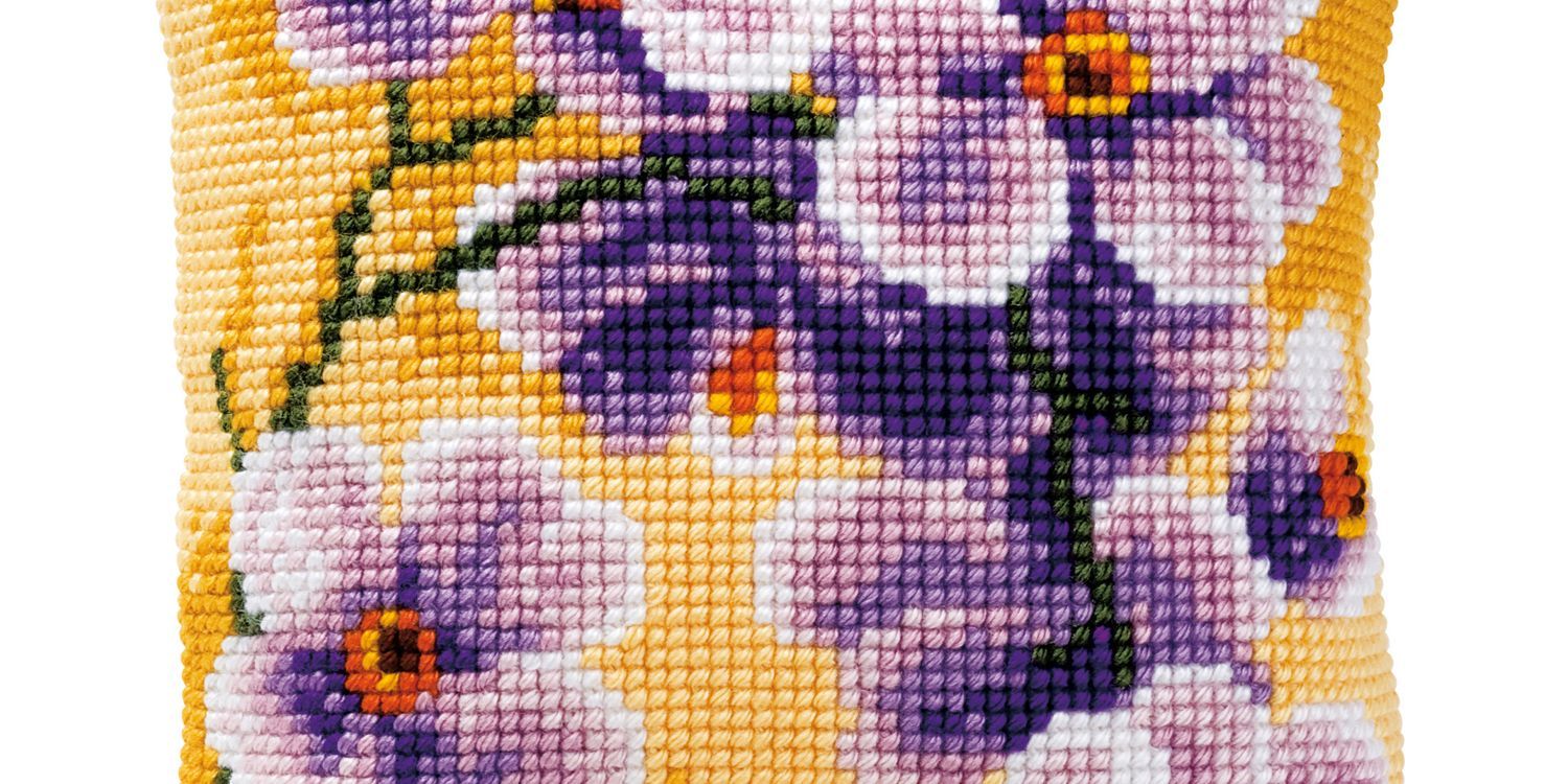 Cushion with cross stitch design. Kit includes: hand-painted, cotton, large hole canvas fabric (18 holes/10cm, 4.5 stitches/inch); thick acrylic yarn; needle, frontsheet picture; instructions in 8 languages (EN, NL, FR, GER, IT, SP, RU, SW). Approximate finished size: (w/h) 40 x 40cm or 16 x 16in. Age category: from 6 years. Stitches used: cross stitch. Difficulty level: very easy.