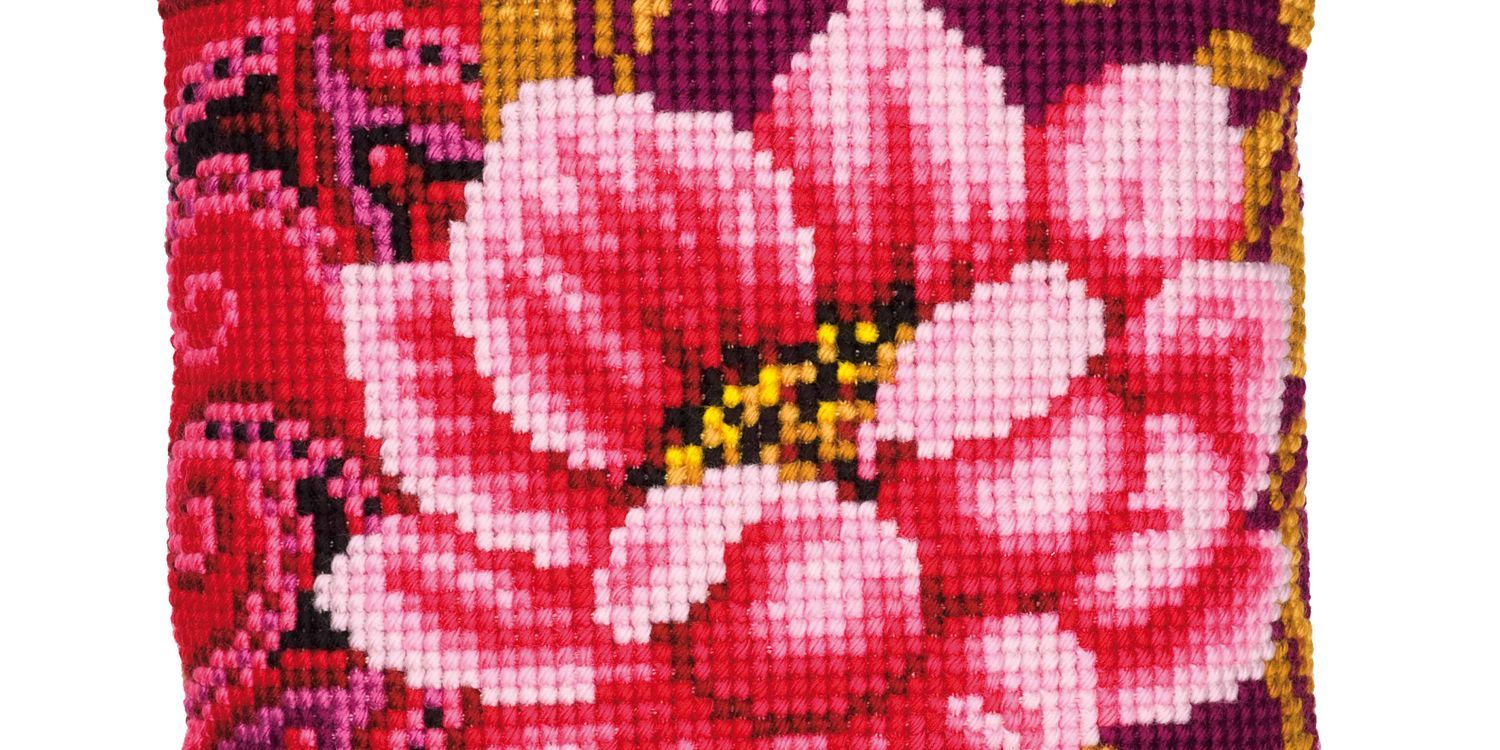 Cushion with cross stitch design. Kit includes: hand-painted, cotton, large hole canvas fabric (18 holes/10cm, 4.5 stitches/inch); thick acrylic yarn; needle, frontsheet picture; instructions in 8 languages (EN, NL, FR, GER, IT, SP, RU, SW). Approximate finished size: (w/h) 40 x 40cm or 16 x 16in. Age category: from 6 years. Stitches used: cross stitch. Difficulty level: very easy.