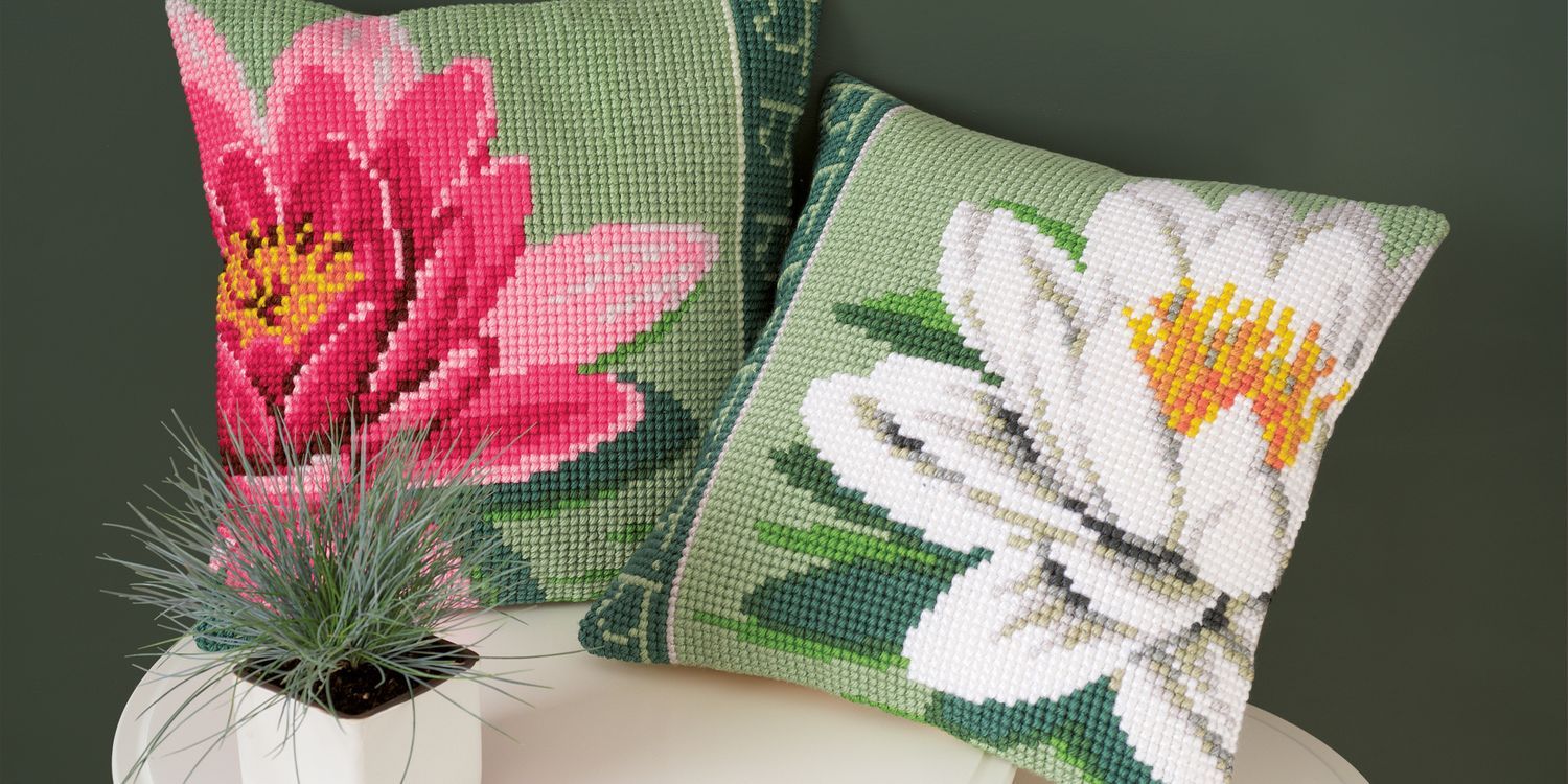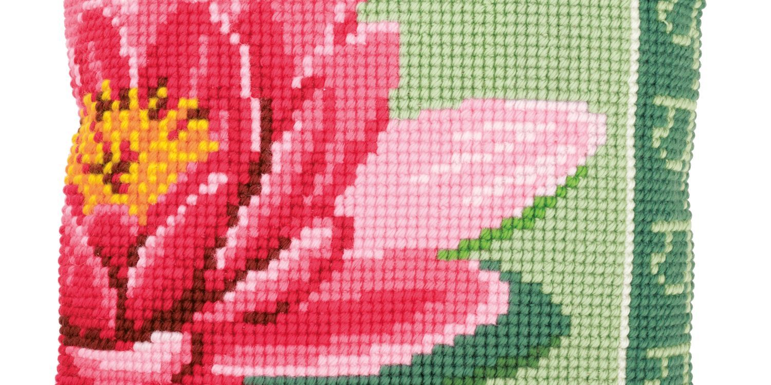Cushion with cross stitch design. Kit includes: hand-painted, cotton, large hole canvas fabric (18 holes/10cm, 4.5 stitches/inch); thick acrylic yarn; needle, frontsheet picture; instructions in 8 languages (EN, NL, FR, GER, IT, SP, RU, SW). Approximate finished size: (w/h) 40 x 40cm or 16 x 16in. Age category: from 6 years. Stitches used: cross stitch. Difficulty level: very easy.