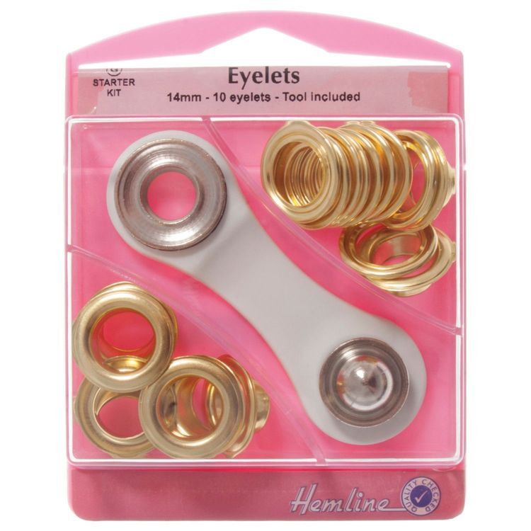 A handy starter set of gold eyelets, 14mm in size, in a non-spill case and high quality application tool.