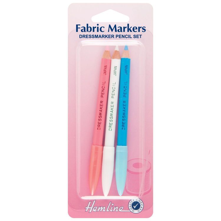 A set of three fabric markers in different colours, of premium quality. There is a pencil for every colour fabric, and the plastic lids protect the points.