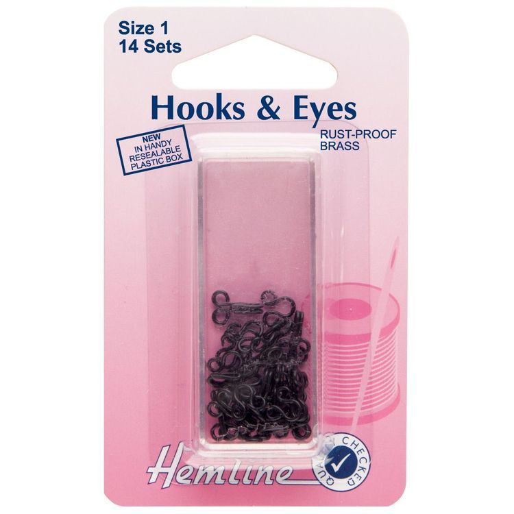 A packet of rustproof brass hooks and eyes with a black coating. They are concealed, flat fasteners used to provide strong closure.