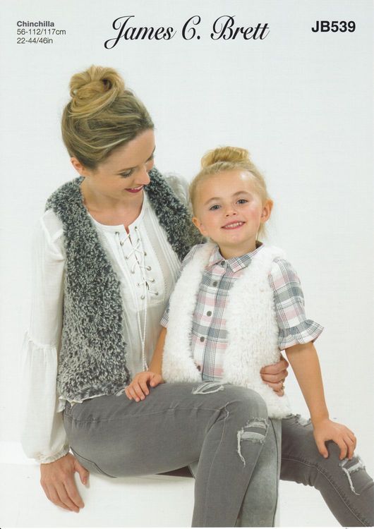 A knitting pattern for Brett Chinchilla yarn, making a woman's and child's waistcoat / cardigan.