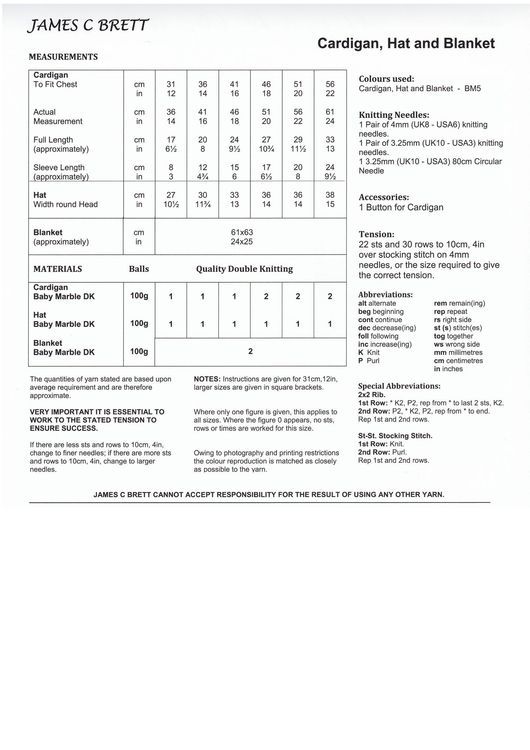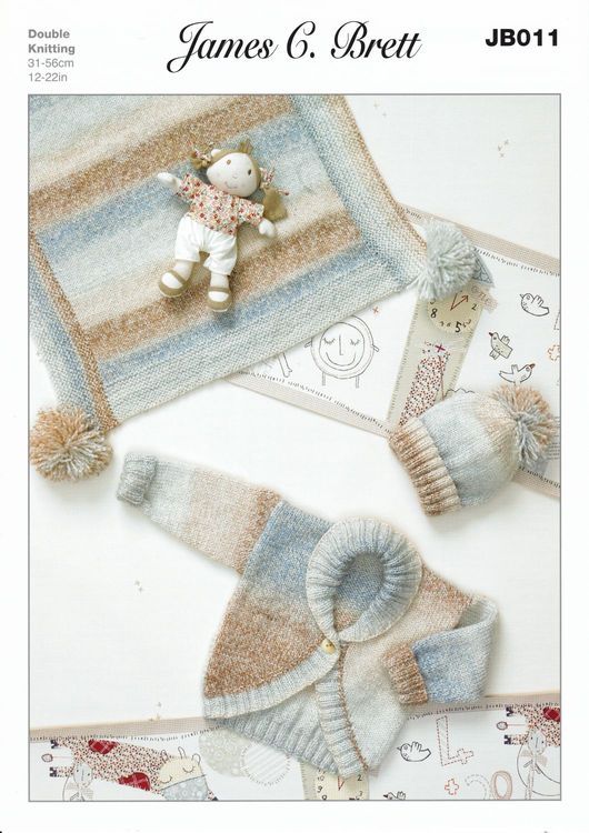 A lovely knitting pattern from James C Brett that makes a blanket, hat and cardigan in DK yarn.