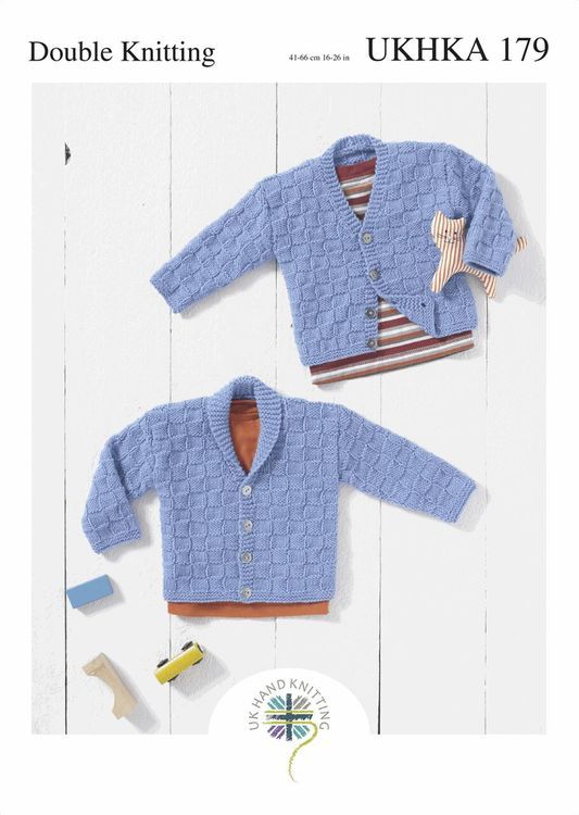 The UKHKA 179 Baby Cardigans Double Knitting Pattern includes two types of cardigan to make; a V-neck and shawl collared style.