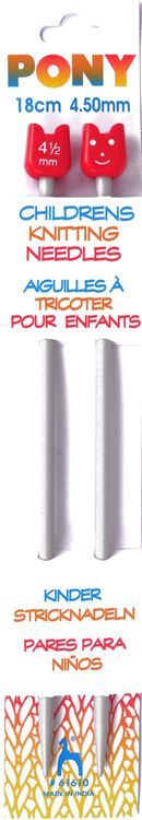 Introduce youngsters to knitting straight away with these great aluminium knitting pins designed for small hands and decorated with playful smiley faces on the ends. 18cm x 4.50mm.