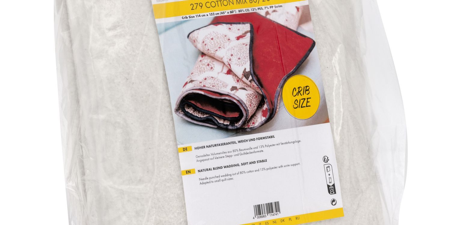 279 Cotton Mix 80/20 is a needle punched wadding made of 80% cotton and 20% polyester. It has the added support of a scrim binder, allowing an excellent combination of a soft feel and a lightweight construction whilst still providing stability and support. Especially developed for quilts but is also suitable for lightweight jackets. To create a durable and high quality product, we recommend a distance between seams of a maximum of 20cm. As it is a natural product, to avoid shrinkage, we recommend soaking the batting, prior to use, in hot water for 20 minutes. Please do not wring when wet, only squeeze gently and allow to dry flat. Size: Queen size 220cm x 270cm.