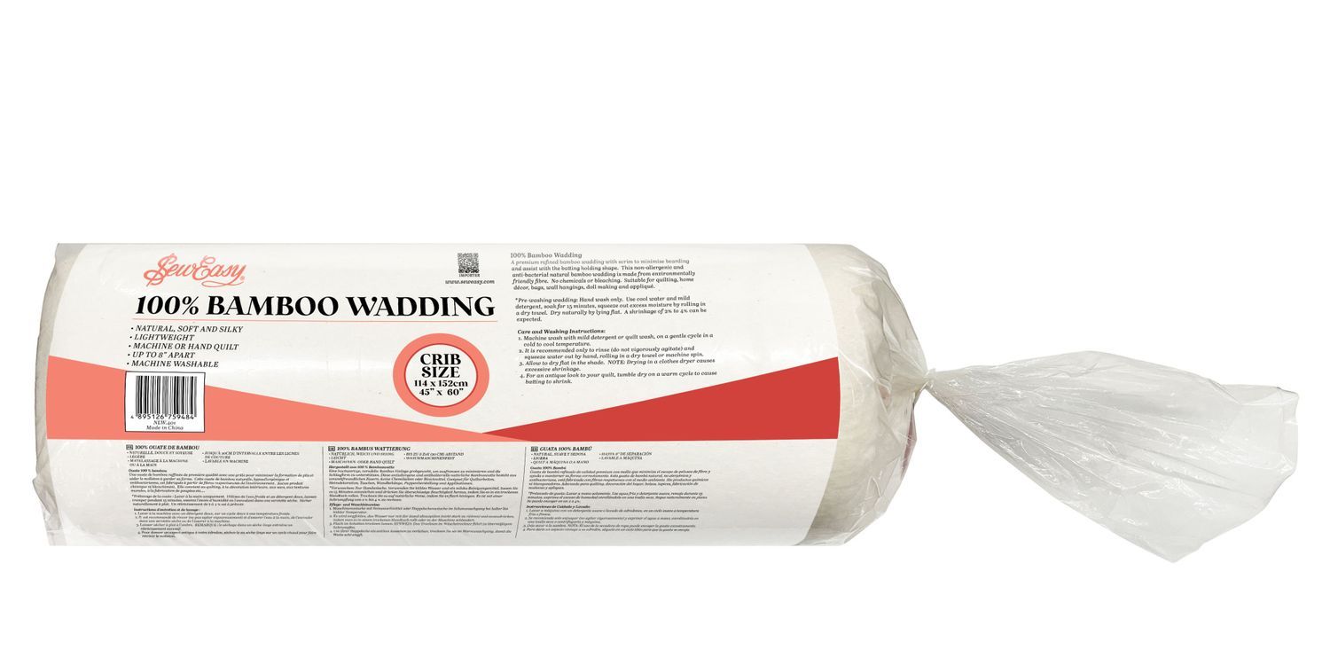 This Sew Easy bamboo wadding is made of 100% natural, soft bamboo fibre, manufactured without chemicals or bleach. Textiles made using bamboo are more breathable than those made from synthetic materials, and therefore are perfect for use as a wadding within a quilt, or garment. Bamboo wadding is antibacterial, eco-friendly, biodegradable and hypoallergenic. Bamboo is a fast-growing, sustainable crop. Shrinkage is less than 5%. Item size: (l/w) 152.4 x 114.3cm. Cold wash only.