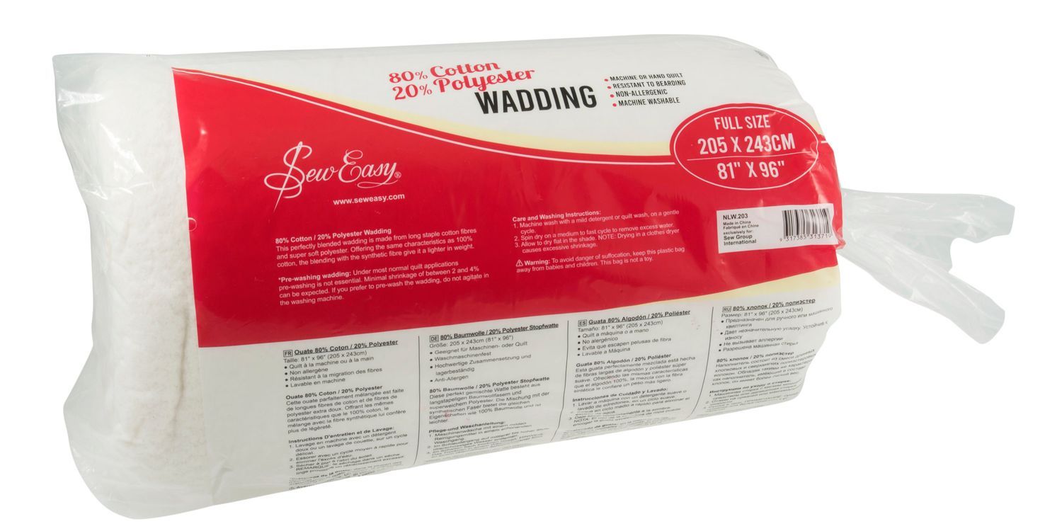 This perfectly blended batting is made from long staple cotton fibres and super soft polyester. Shrinkage 2-4%. Needle punched. Can be hand or machine stitched up to 4 inches apart. Washable at 40 degrees. Item size: (w/l) 205.7 x 243.8cm or 81 x 108in.