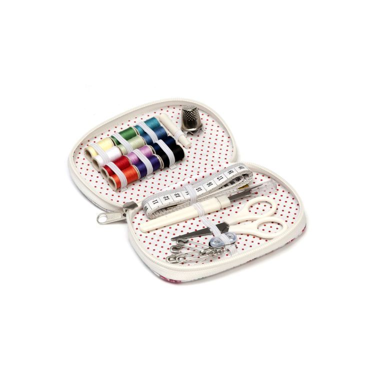 All the tools you'll need to mend your favouirte garments in a handy rose spot zip case from HobbyGift. Includes scissors, 6 safety pins, seam ripper, tape measure, 3 needles, thimble, 12 coloured mini thread spools.