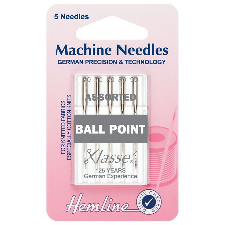 A mixed pack of sewing machine ball point needles, designed for knit fabrics, jerseys and interlocks.