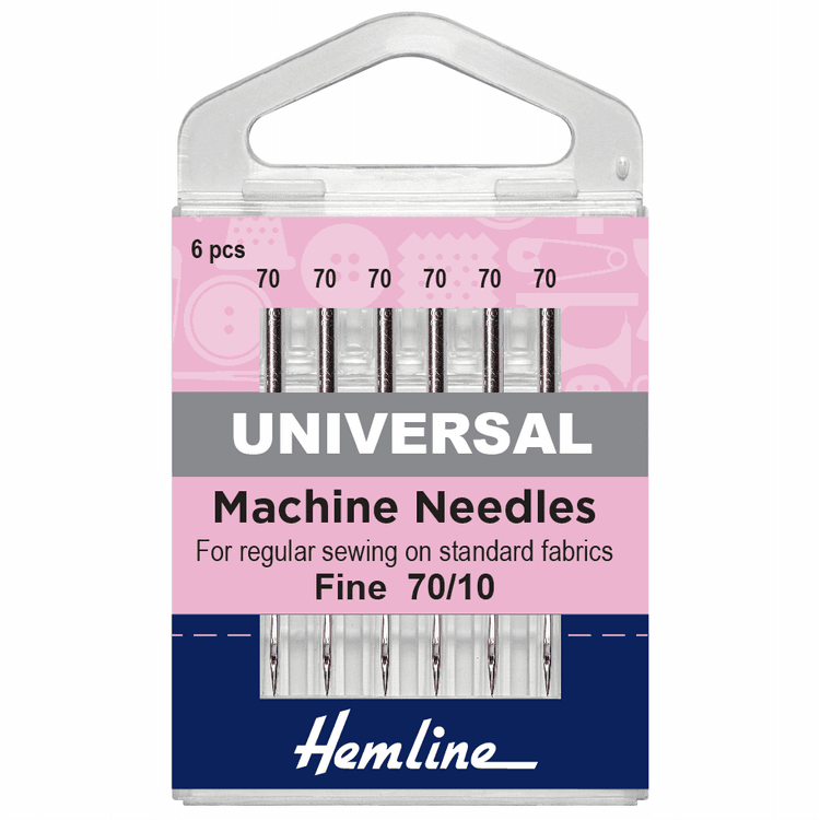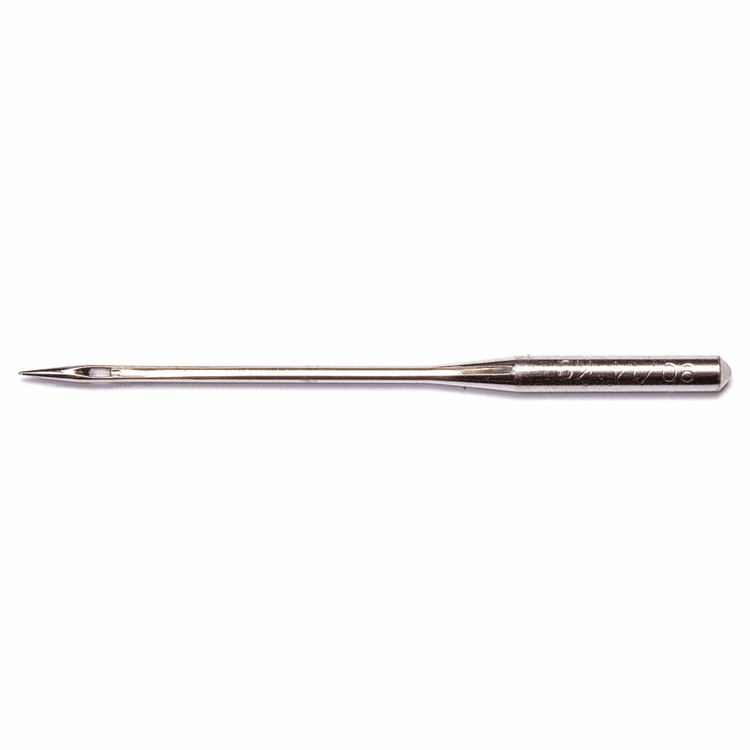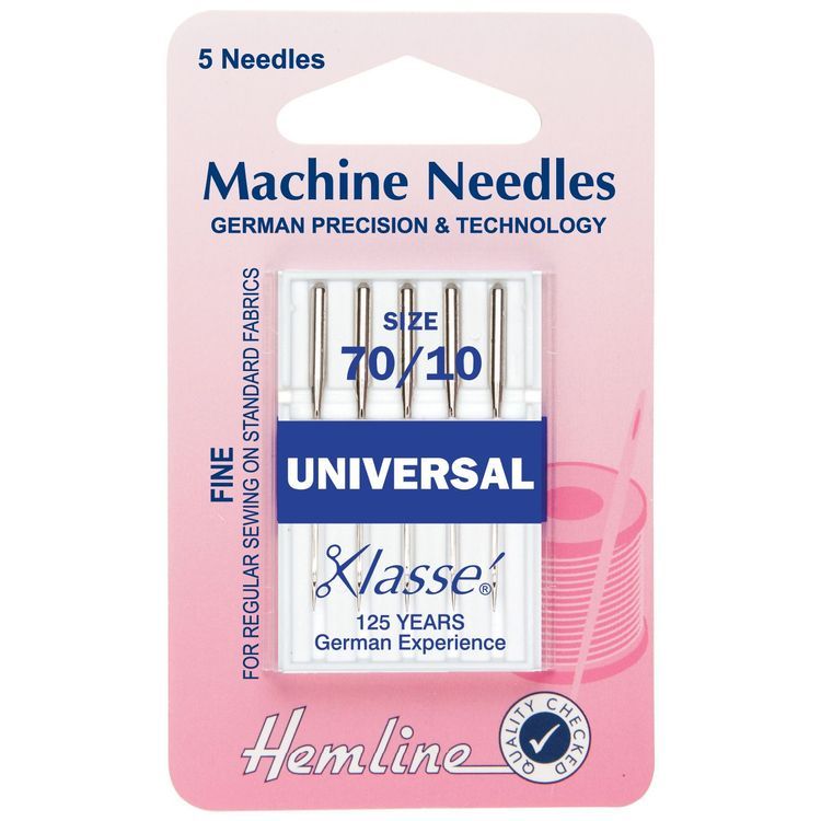 A set of five universal sewing machine needles, with a slight ball point. Suitable for general sewing on woven and knit fabrics.