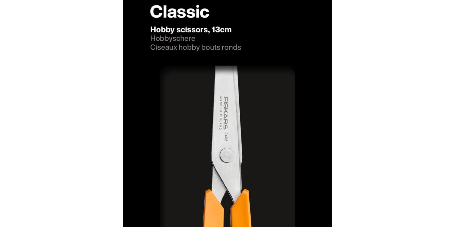 The new and improved version of F9891 (1005154). The new Fiskars Classic scissors feature improved handle and screw design with new blade stamp and packaging. These iconic, orange-handled, classic scissors are reliable and high-quality, making them the perfect long-term investment. The 13cm hobby scissors are ideal for cutting a variety of light materials while crafting. Short, safe blades that are ideal for children and can be safely placed in pockets. The ergonomic and impact resistant handles ensure a good and comfortable grip.