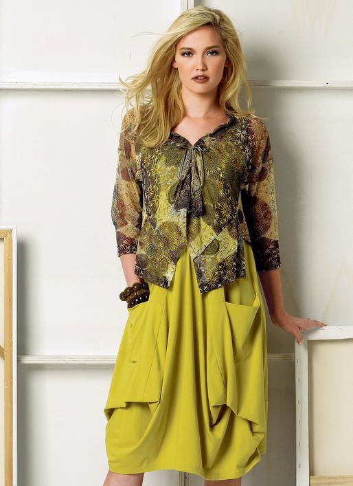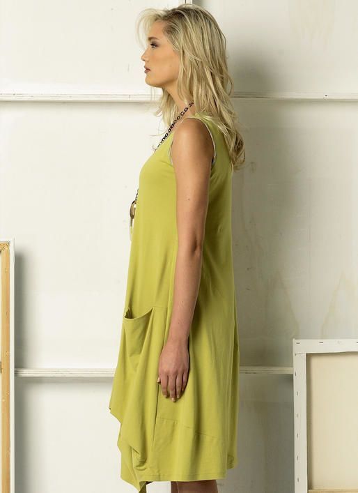 Very loose-fitting, pullover dress (close-fitting through bust) has scoop neckline, seam detail forming draped pockets and shaped hemline, and front longer than back. A: Sleeveless, bias binding for neckline and armholes. B: Three-quarter sleeves, contrast fabrics and neck band. Loose-fitting, unlined jacket has dropped shoulders, purchased drawstring for neckline, front and back cut-in-one, side panel, no shoulder or side seams, and side front slits. A, B, C: Stitched hem. Wrong side shows on front hemline A, B and draped front C.