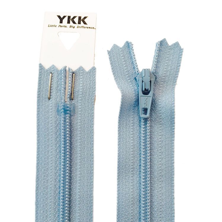 A sky blue nylon coil zip that can be used on skirts, dresses and trousers.