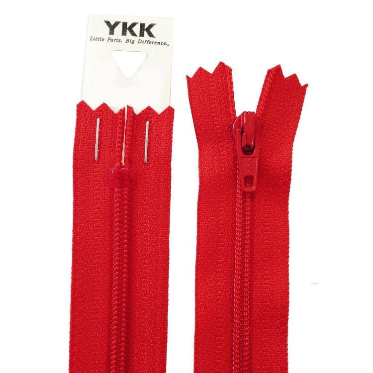 A red coil zip, suitable for repairing and customising your favourite skirts, dresses and trousers.